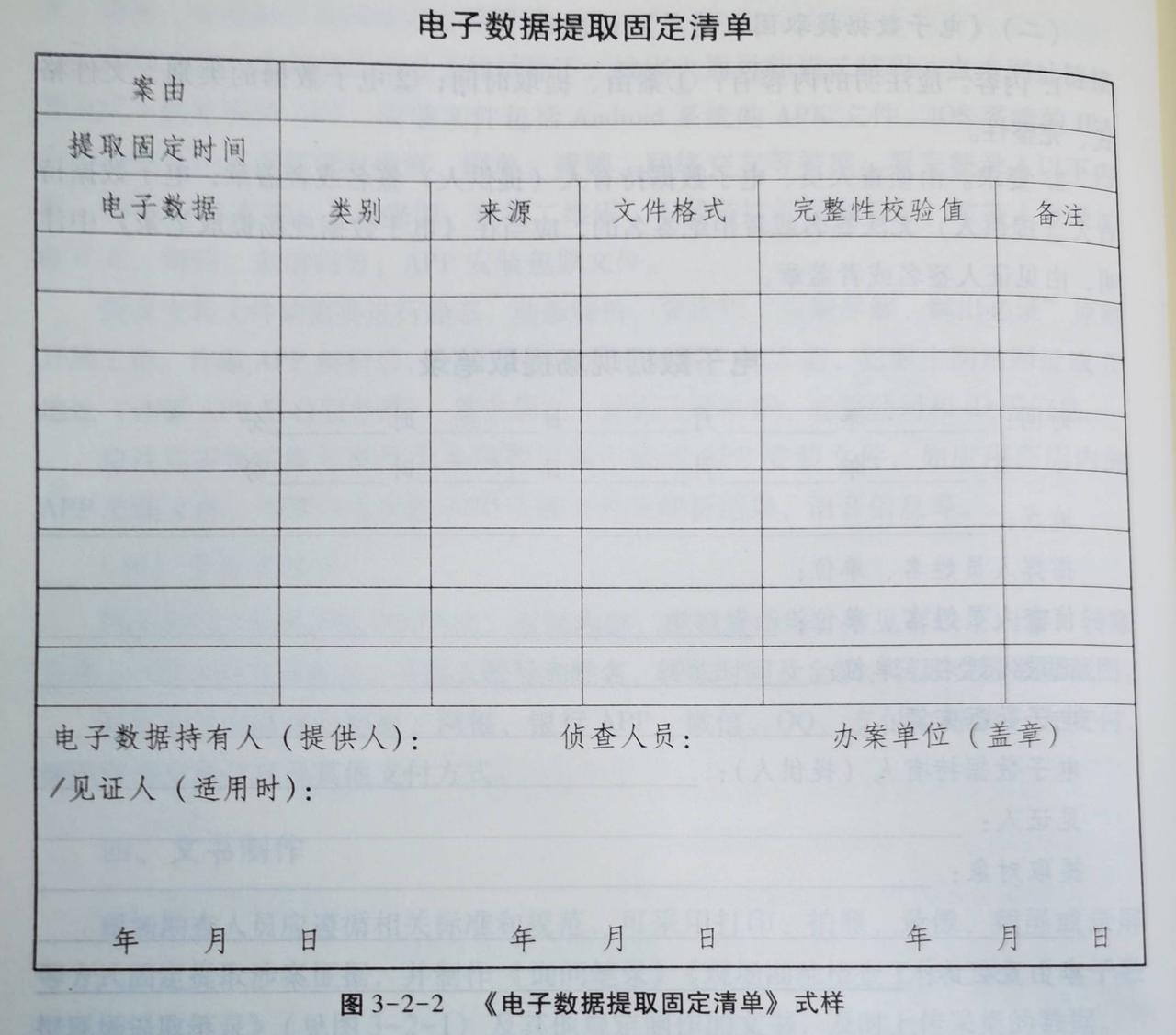 2.要求。①笔录由侦查人员、被害人或报案人签名或电子信息授权;②附《电子数据提取固定清单》(见图3-2-2)和涉案电子设备照片、截图;③无论采取何种方式固定电子数据,均应当能清晰地反映涉案电子数据的内容,并在笔录中注明选取固定方式的原因以及文件路径和文件属性;④现场勘查人员应当自勘查取证结束后24小时内,将勘验信息准确、规范上传到"全国公安机关现场勘验信息系统”。