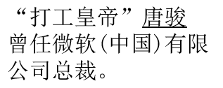 唐骏毕业于北京邮电学院,后来又到日本、美国留学,先后获得物理学学士、工程学硕士和计算机学博士。唐骏早年发明了两种现在非常受年轻人欢迎的机器:大头贴机和卡拉OK打分器,他的第一桶金也来自于此,尽管今天看来当时他卖得太便宜了。1994年,32岁的唐骏进入美国微软公司,从程序员一直做到中国区总裁,收入超过1亿元。因为业绩辉煌,他被授予了微软公司终身荣誉总裁称号。2004年,42岁的唐骏闪电加盟盛大网络,盛大给他的日薪达到50万元人民币,四年收入至少4亿元,并由此获得了“打工皇帝”的称号。2008年4月,唐骏宣布以10亿的天价“转会”民营企业新华都集团,接替集团创始人陈发树任公司总裁兼CEO,10亿“转会费”主要以股权的形式给予。