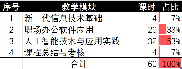 本课程总学时60学时,其中新一代信息技术基础模块4学时,职场办公软件应用模块20学时,人工智能技术与应用实践模块32学时,课程总结与考核(4课时)具体授课进程安排如下:
