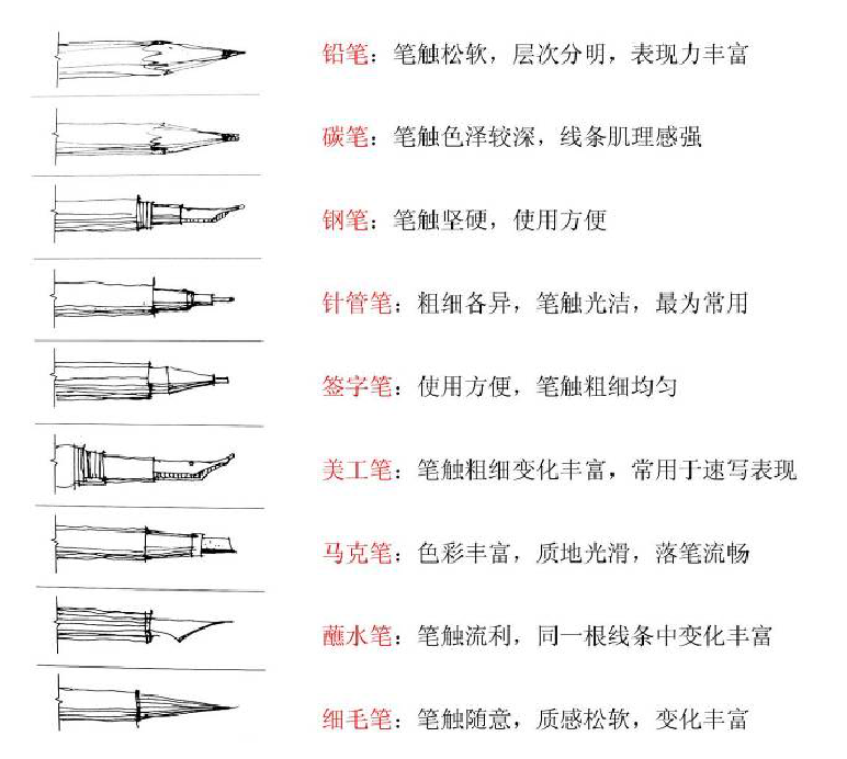 1、美工钢笔:笔头弯曲,可画粗、细不同的线条,书写流畅,适用于勾画快速草图或方案。