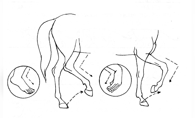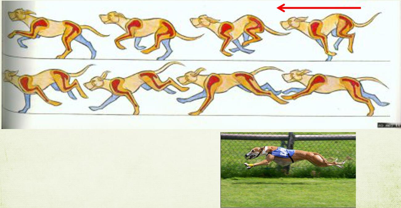 前腿抬起时,腕关节向后弯曲;后腿抬起时踝关节朝前弯曲。