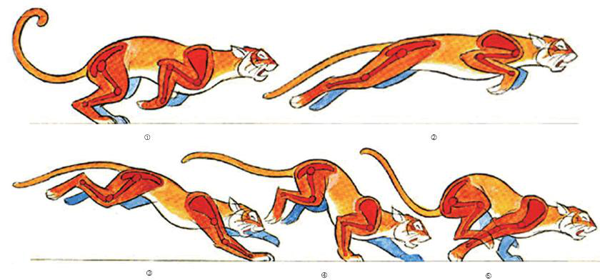躯干先往后收缩成蹲状,准备力量,利用后腿有力一蹬,把身躯弹出。在运动过程中,身体悬空,前肢弯起伸向前方,准备着地。着地时,前肢先接触地面,承受身体前冲运动的惯性作用,身躯会由挺直到蜷缩。后腿着地后,冲力减弱才回复原状。