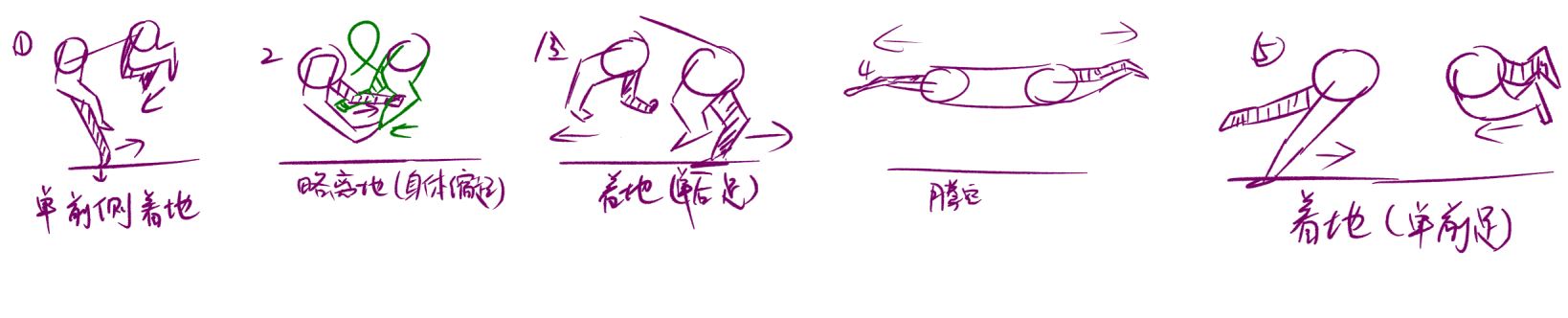 踏地踮起、蜷缩(略离地)、着地(单脚)、腾空(伸展身体)、着地(单脚)、下一个奔跑