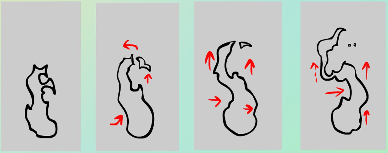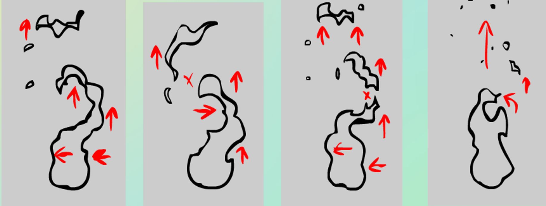 无论是大火还是小火苗的运动,都可以用七种基本动态来概括。即:①扩张 ②收缩 ③摇晃 ④上升 ⑤下收 ⑥分离 ⑦消失