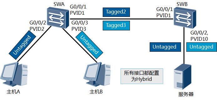 3、G0/0/1 Hybrid,PVID=1,TAG=2,3,10 ,UNTAG=空