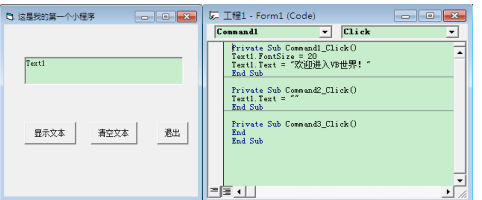 制作一个界面如图所示,要求单击“显示文本”按钮,则文本框中显示“欢迎进入VB世界!”;单击清除按钮,则清除文本框中的内容;单击退出按钮,则结束程序的运行。(作业的代码窗口参考如下图所示)