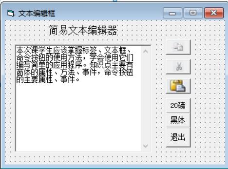 (1)请设计如下图所示的界面,然后在文本框中输入任意一段文字内容,并对它进行简单的格式设置,也可以对选择的文字内容进行复制、剪切、粘贴等编辑操作。