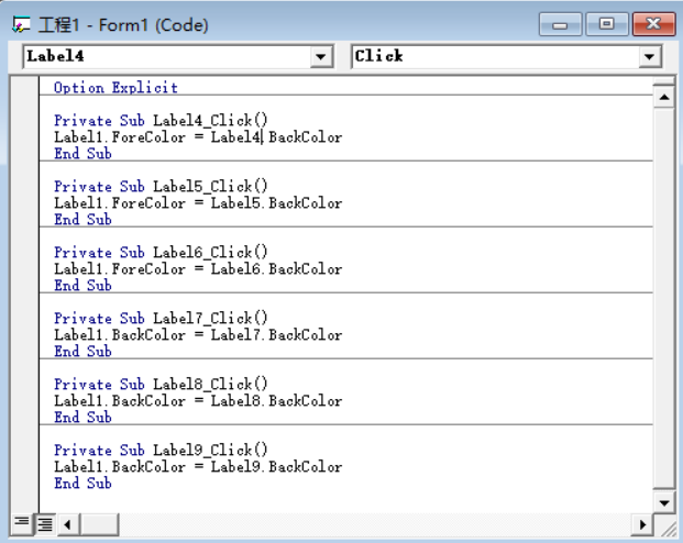 程序运行时单击“蓝色”、“红色”和“黑色”标签,标签Label1中的“程 序设计基础教程”的字体颜色分别变成蓝色、红色和黑色;单击“青色”、 “黄色”和“白色”标签,标签Label1的背景色分别变成青色、黄色和白色(3)程序代码编写如下: