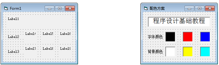 (1)设计要求:在标题为“配色方案 ”的窗体Form1上添加9个标签,接着设置标签Label1的标题为 “程序设计基础教程”、字号为“三号”、边框样式为带边框、文本内容居中、背 景为白色;然后设置标签Label2和Label3的标题分别为“字体颜色”和“背景颜色”, 并设置其能自动调整大小;最后设置标题Label4到Label9的标题为空、边框样式为带 边框、并将背景颜色分别设置为“黑色”、“红色”、“蓝色”、“白色”、“黄 色”和“青色”。如下图设计界面: