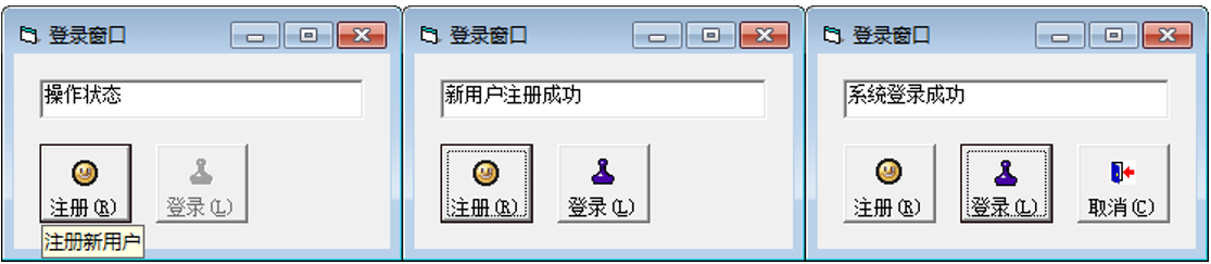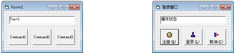 设计要求:在标题为“登录窗口”的窗体Form1上,添加一个文本内容为“操作状态”的文本框Text1;接着添加3个标题分别为“注册”、“登录”和“取消”的命令按钮 Command1、Command2和Command3,按钮上显示相应的图标,其中“注册”按钮的访问键为“R”、提示信息为“注册新用户”,并设置其为窗体的默认按钮; “登录”按钮的访问键为“L”、提示信息为“用户登录”、并设置其初始状态不可用;“取消”按钮的访问键为“C”、提示信息为“退出系统”、并设置其初始状态 为不可见,同时设置其为窗体的默认取消按钮。具体操作界面如下: