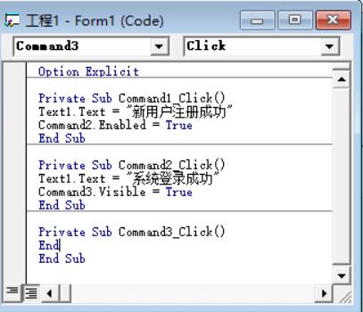 运行要求: 程序运行时,单击“注册”按钮,在文本框中显示“新用户注册成功”,并将“登录”按钮设置为可用状态;单击“登录”按钮,在文本框中显示“系统登录成功”, 并显示“取消”按钮;单击“取消”按钮,结束程序运行。具体运行界面如下: