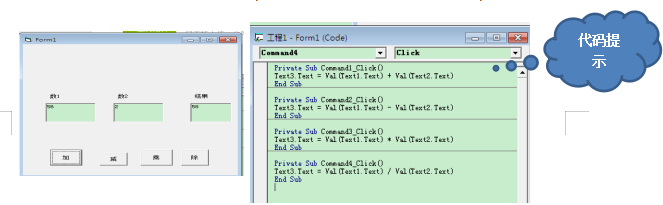2、运行要求:单击四个命令按钮,实现加、减、乘、除运算,从而实现一个简单计算器运算功能。界面设计和程序代码参考如下:
