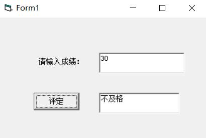 请通过一个文本框输入一学生成绩,让后单击命令按钮“评定”,将评定结果显示在第二个文本框中。成绩等级评定的方法是:90~100分为“优秀”,80~89分为“良好”,70~79分为“中等”,60~69分为“及格”,60分以为“不合格”。设计界面如下所示:(请同学们尝试用if多分支结构和情况语句select case去实现)