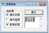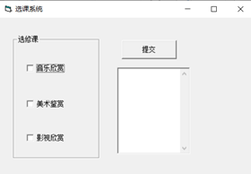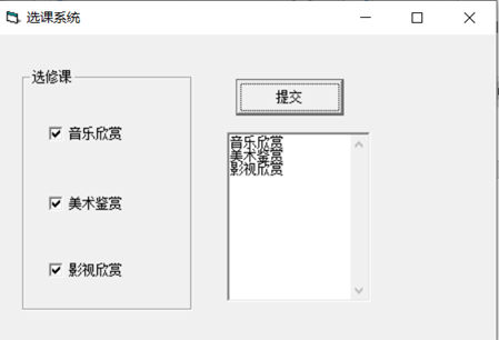 新建工程文件,设置窗体的标题为“选课系统”,在窗体Form1上,添加一个标题为“选修课”的框架Frame1,并在Frame1 中添加3个标题分别为“音乐欣赏”、“美术鉴赏”和“影视欣赏”的复选框Check1、Check2和Check3;然后再添加一个标题为“提交”的命令按钮Command1;最后添加一个文本内容为空、有垂直滚动条的文本框Text1。程序运行时,选择相应的复选框,单击“提交”按钮,将选择结果按顺序分行显示在Text1中。完成上述设计后,以姓名加学号后两位保存工程,并生成可执行文件(*.exe),并上交可执行作业文件。