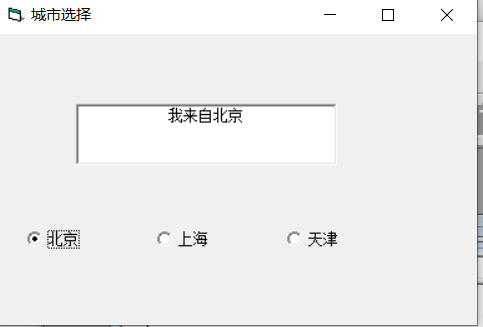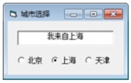 新建工程文件,设置窗体的标题为“城市选择”,然后在窗体Form1上,添加一个文本内容为“我来自上海”的文本框Text1,其内容居中显示;然后再添加3个标题分别为“北京”、“上海”和“天津”的单选按钮Option1、Option2和Option3,其中Option2处于选中状态。程序运行时,单击某个单选按钮,则在Text1 中显示对应的内容。完成上述设计后,以姓名加学号后两位保存工程,并生成可执行文件(*.exe),并上交可执行作业文件。