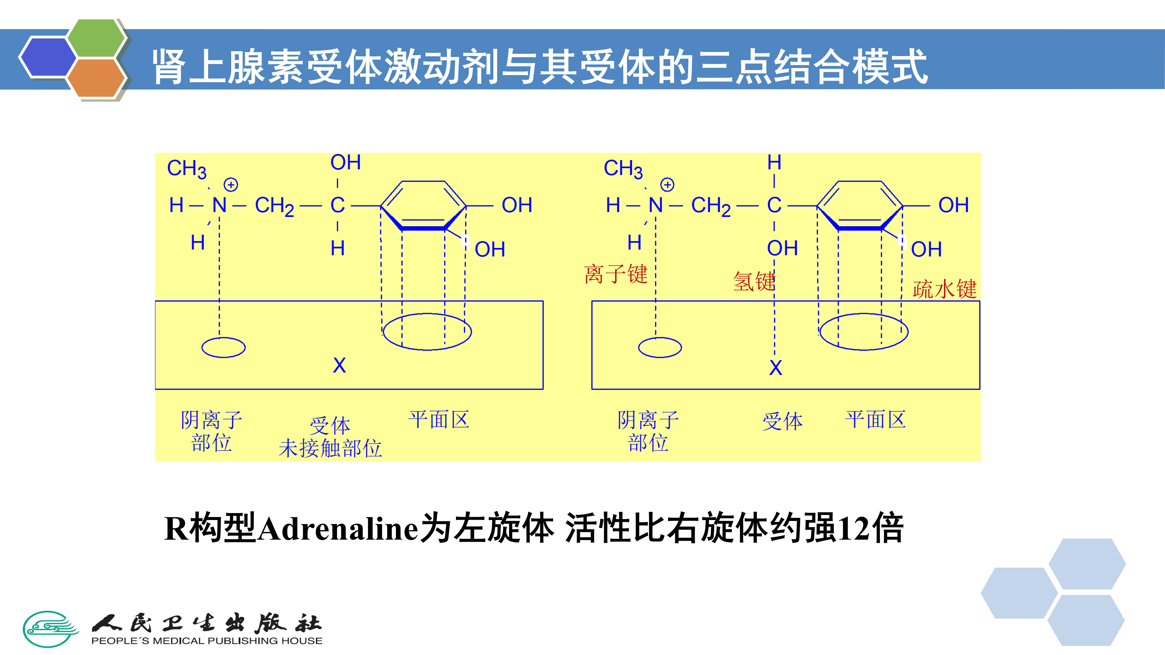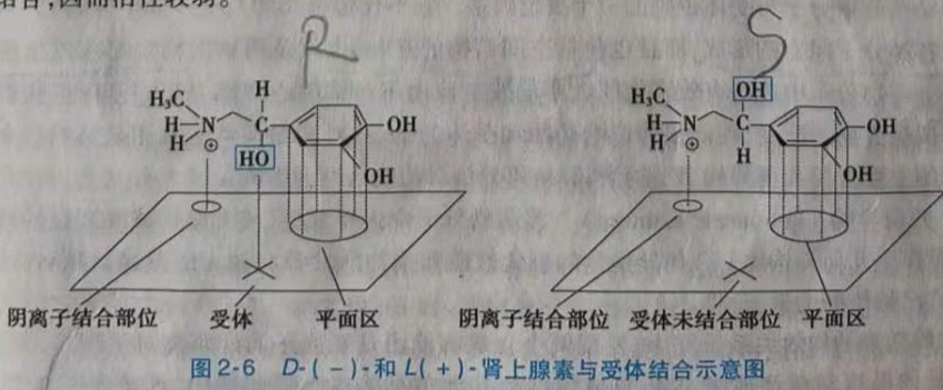 (2) 两个对映异构体均具有同类型的活性,但活性强度可能相同或不同。例如,左旋和右旋氯喹具有相同的抗疟活性;而在有的药物中,左旋体和右旋体的生物活性则不相同,例如,D-(-)-异丙肾上腺素的支气管扩张作用为L-(+)-异构体的异丙肾上腺素的800倍;D-(-)-去甲肾上腺素的支气管舒张作用为L-(+)-异构体的70倍;D-(-)-肾上腺素的血管收缩作用为L-(+)-肾上腺素的12~20倍,其生物活性的差异反映了光学异构体与受体结合时的立体选择性。一般认为,这类药物需要通过三点与受体结合,如图2-6中D-(-)-肾上腺素通过下列三个基团与受体在三点结合:氨基;苯环及其二个酚羟基;侧链上的醇羟基。而L-异构体只能有两点结合,因而活性较弱。