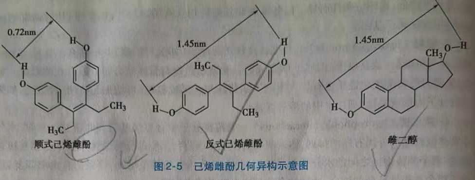在雌激素的构效关系研究中,发现两个含氧官能团及氧原子间的距离对生理作用是必需的,而甾体母核对雌激素并非必需结构。人工合成的反式已烯雌酚中,两个羟基的距离是1.45nm,这与雌二醇两个羟基的距离近似,表现出较强的生理活性。顺式已烯雌酚羟基间距离为0.72nm,作用大大减弱。
