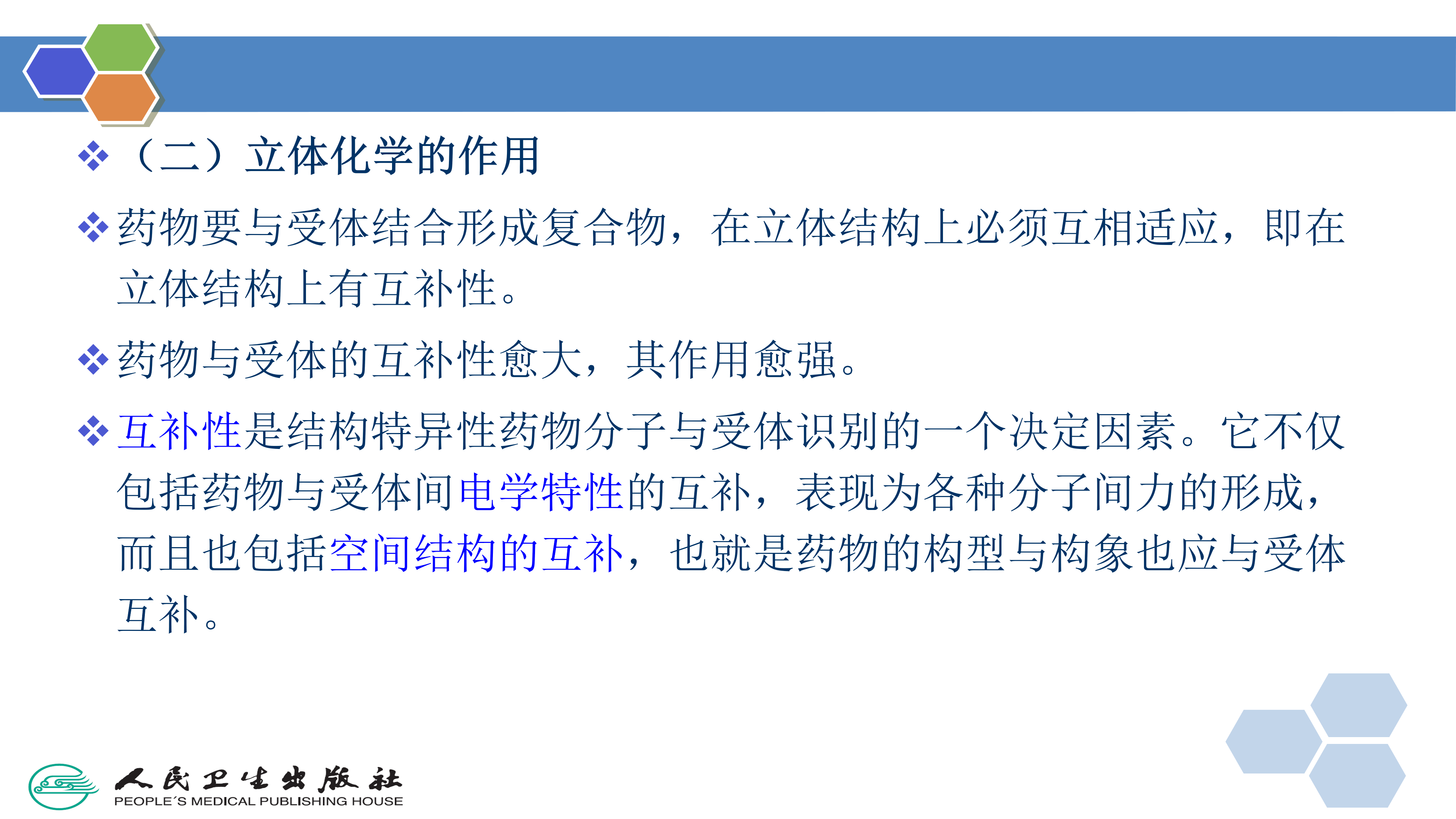 蛋白质和其他生物大分子是非对称的,药物与受体分子的识别和结合过程是在三维空间中发生的,立体互补性是实现该过程的重要因素。药物要与受体结合形成复合物,在立体结构上必须互相适应,即在立体结构上有互补性。药物与受体的互补性愈大,其作用愈强。互补性是结构特异性药物分子与受体识别的一个决定因素。它不仅包括药物与受体间电学特性的互补,表现为各种分子间力的形成,而且也包括空间结构的互补,也就是药物的构型与构象也应与受体互补。药物分子中某些有效官能团大小的改变或由不对称中心转换引起的基团空间排列或分子内偶极方向的改变,均能强烈影响药物和受体的结合,对药物活性也有明显影响。立体化学的作用主要介绍几何异构、光学异构和构象异构对药物活性的影响。