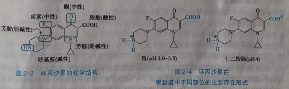 一个分子中可能含有多种官能团,而具有酸碱两性。例如,喹诺酮类抗菌药环丙沙星(ciprofloxacin)(图2-3)含有一个烷基仲氨基和一个羧酸基,根据溶液的pH,这个分子既可以接受一个质子,也可以给出一个质子,或同时发生,是一个两性化合物,其pKa(HA)、pKa,(HB+)分别为6.0和8.8。在胃肠不同阶段,有不同的酸碱性,因此环丙沙星有不同的解离形式,在pH4.0时,烷氨基和羧基均被离子化;在pH为1.0~3.5时,只有烷氨基团离子化(图2-4)。