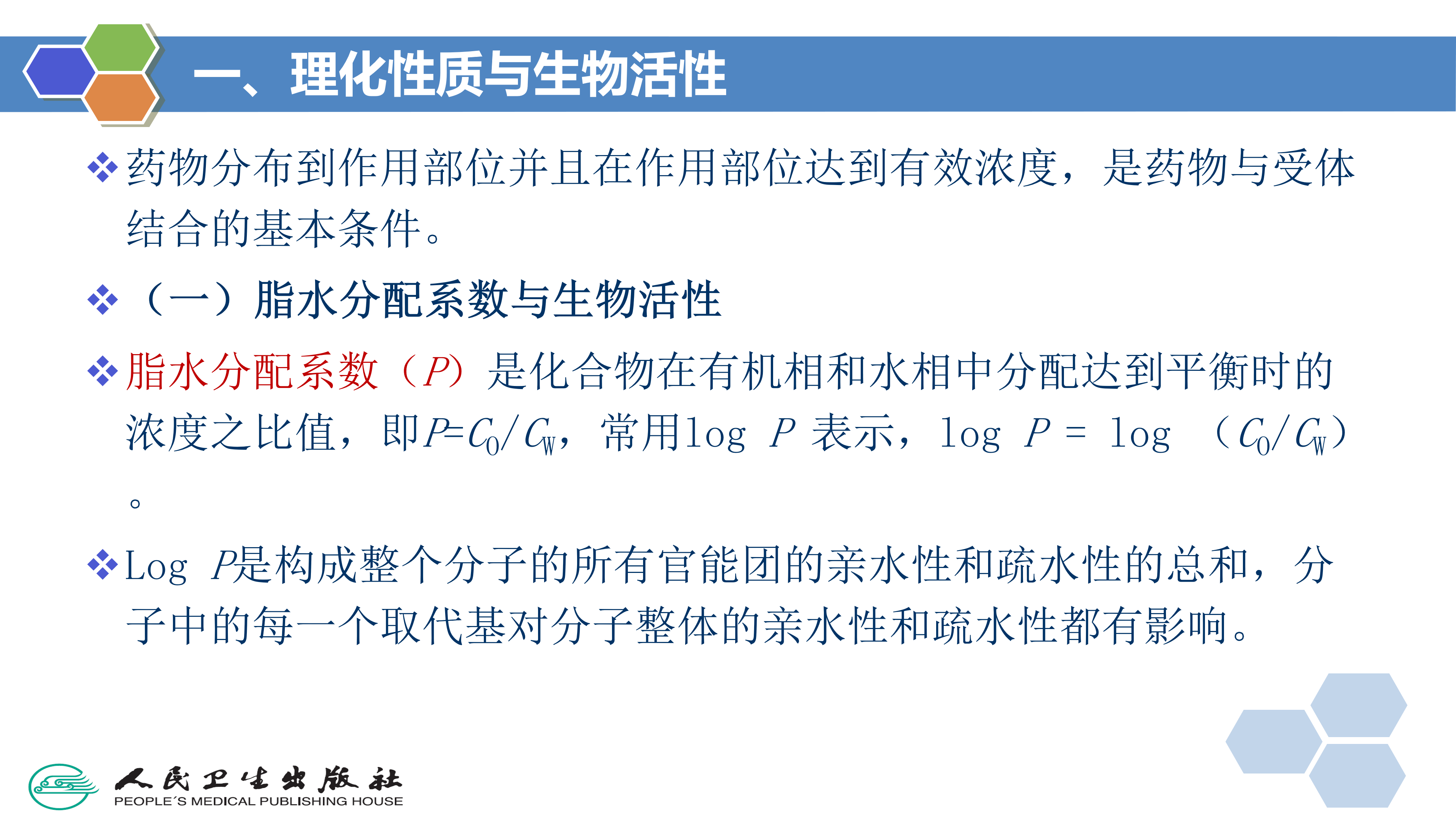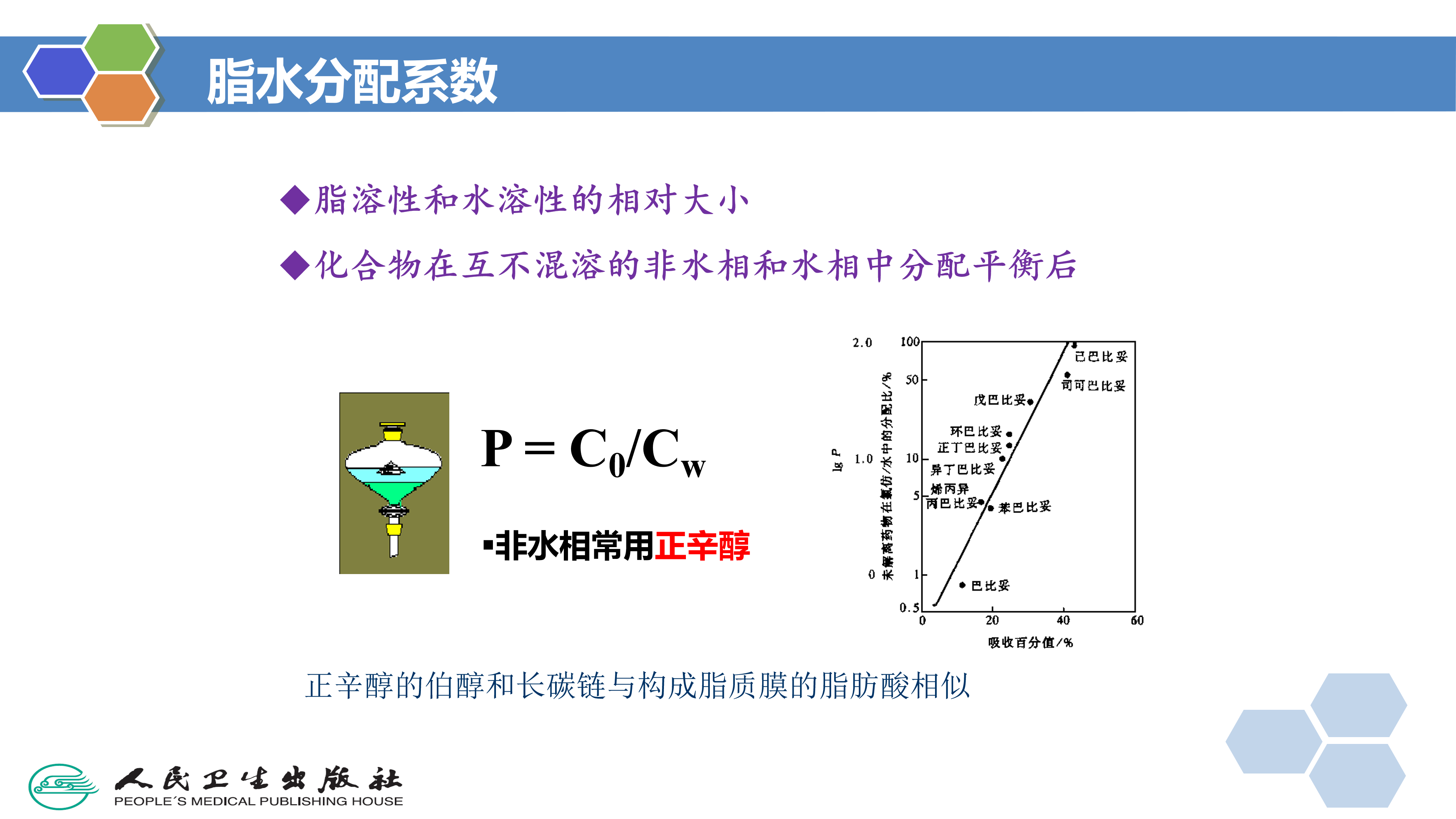 脂水分配系数(lipid-water partition coefficient,P)是化合物在有机相和水相中分配达到平衡时的浓度之比值,即P=C0/w,常用logP表示,logP=log(Co/Cw)。在构效关系研究中,常选用正辛醇(1-octanol).为有机相测定脂水分配系数,因为正辛醇有一个极性基团(伯醇)和一个长的碳链,与构成脂质膜的脂肪酸相似。药物转运扩散至血液或体液,需有一定的亲水性( hydrophilicity);药物通过脂质的生物膜转运,需有一定的亲脂性( lipophilicity))或疏水性(hydrophobicity)。
