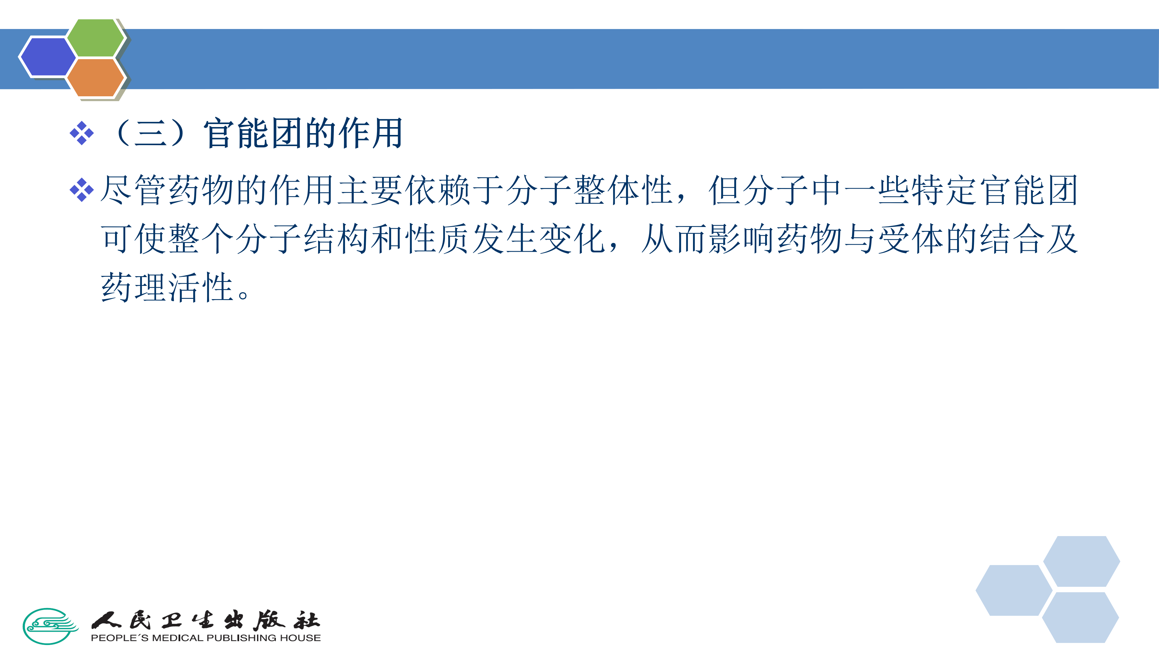 尽管药物的作用主要依赖于分子整体性,但分子中一些特定官能团可使整个分子结构和性质发生变化,从而影响药物与受体的结合及药理活性。在药物设计中需要考虑这些官能团的影响。一个药物分子中常有多种官能团,每种官能团对药物性质的影响不同,如诺氟沙星分子结构中含有6种以上不同性质的官能团,对活性、毒性、药代动力学等产生不同影响及综合影响。