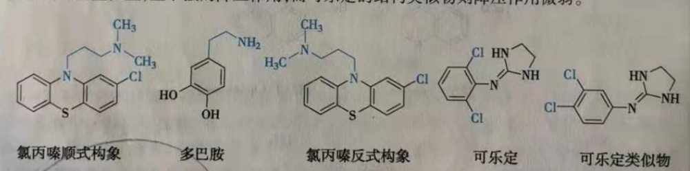 一些结构相似的药物,往往由于某个部位取代基的变化使化合物的构象发生了重大改变,进而使活性强弱发生改变,甚至显示出不同的生理活性。经典的抗精神病药物是多巴胺受体阻断剂,要求其构象和多巴胺( dopamine)有一定的构象相似性,才能和多巴胺受体更好的结合发挥效应。氯丙嗪( chlorpromazine)正是由于苯环2位的氯原子引起了分子的不对称性,使侧链倾斜于含氯原子的苯环方向(顺式构象),X-射线衍射测定表明氯丙嗪这一构象和多巴胺的构象能部分重叠。失去氯原子则不能保持这一构象,化合物也无抗精神病作用。再如,可乐定( clonidine)分子的卤素原子均处于邻位取代,由于空间位阻限制了键的自由旋转,从而使两个芳香环保持相互垂直位置,显示强的降压作用;而可乐定的结构类似物则降压作用微弱。