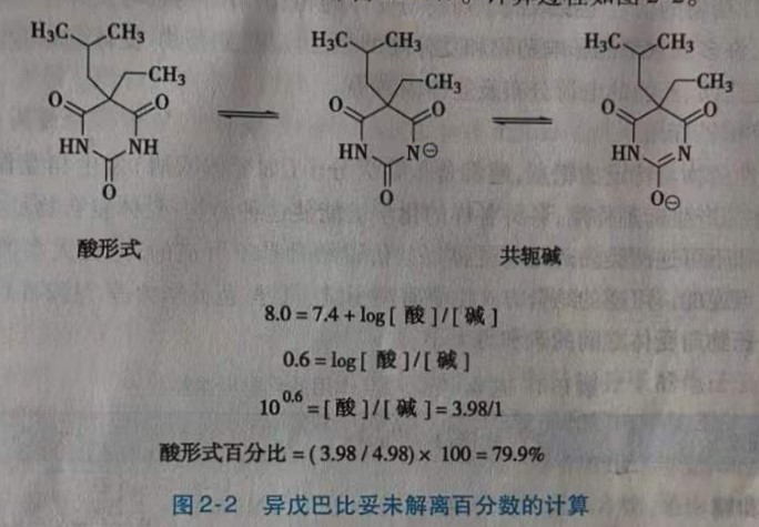 如果知道分子中的官能团是酸性还是碱性,便可预测该分子在给定pH下是否可以被离子化。如果知道该分子中官能团的pKa和分子周围环境的pH,可定量预测分子的离子化程度。例如,巴比妥酸( barbital acid)的pKa为4.12,在pH7.4时,99%以上解离,以离子状态存在,不能透过细胞膜和血脑屏障,故无镇静作用。异戊巴比妥( amobarbital)pKa为8.0,在pH为7.4时未解离(酸形式)占79.9%,离子化(共轭碱)占20.1%。计算过程如图2-2。