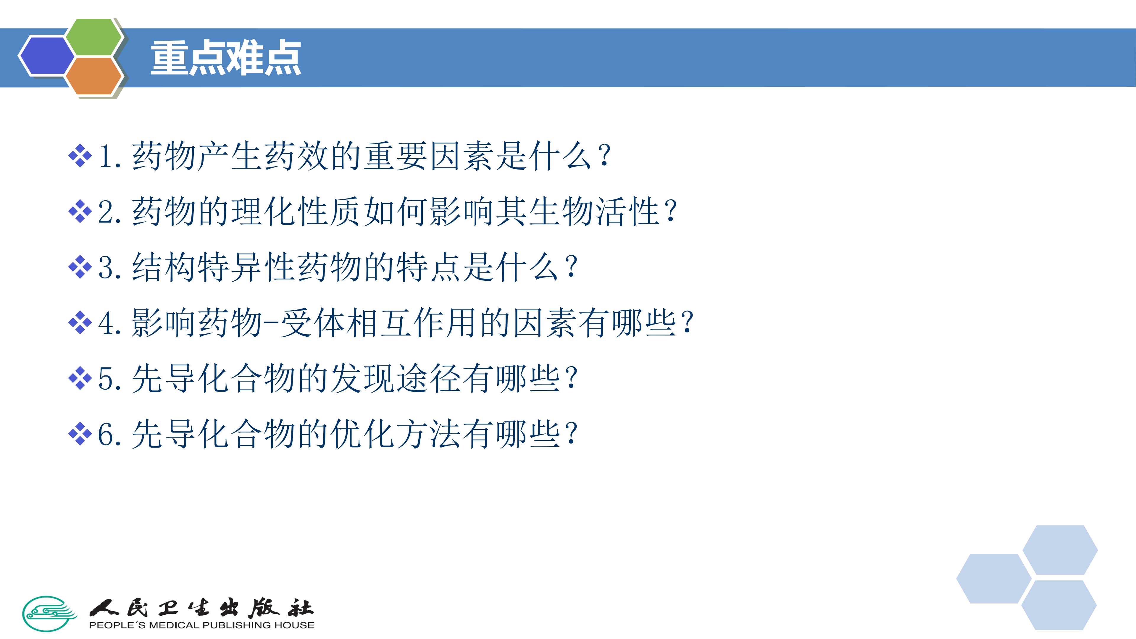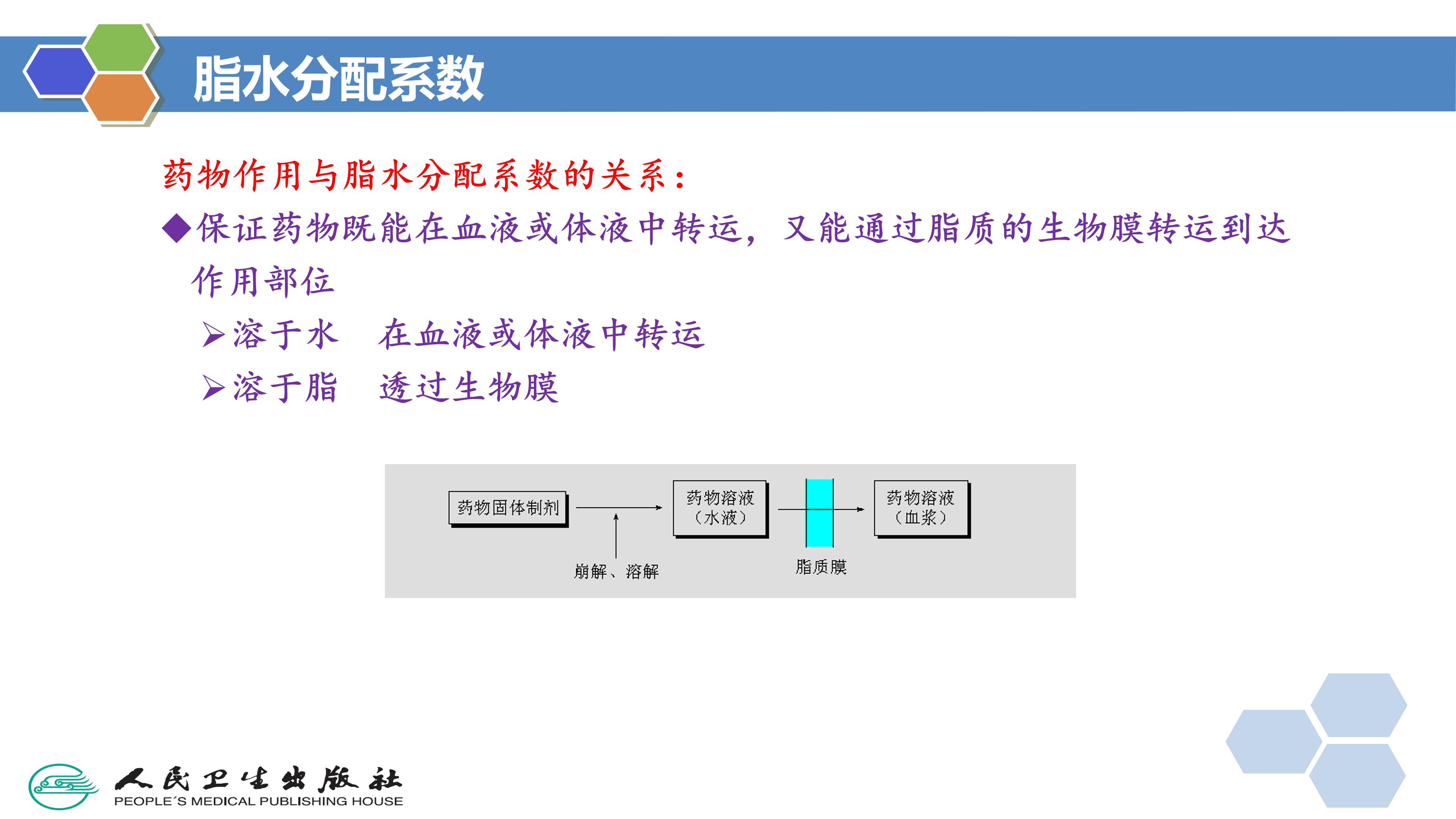 药物口服给药后,药物经胃肠道吸收进入血液。药物在转运过程中,必须通过各种生物膜,才能到达作用部位或受体部位。药物分布到作用部位并且在作用部位达到有效浓度,是药物与受体结合的基本条件。但是,能和受体良好结合的药物并不一定具有适合转运过程的最适宜理化性质参数,如有些酶抑制剂在体外实验具有很强活性,但因它的脂水分配系数过高或过低,不能在体内生物膜的脂相-水相-脂相间的生物膜组织内转运,无法到达酶所在的组织部位,造成体内实验几乎无效。因此,设计新药时必须考虑到化合物的理化性质。