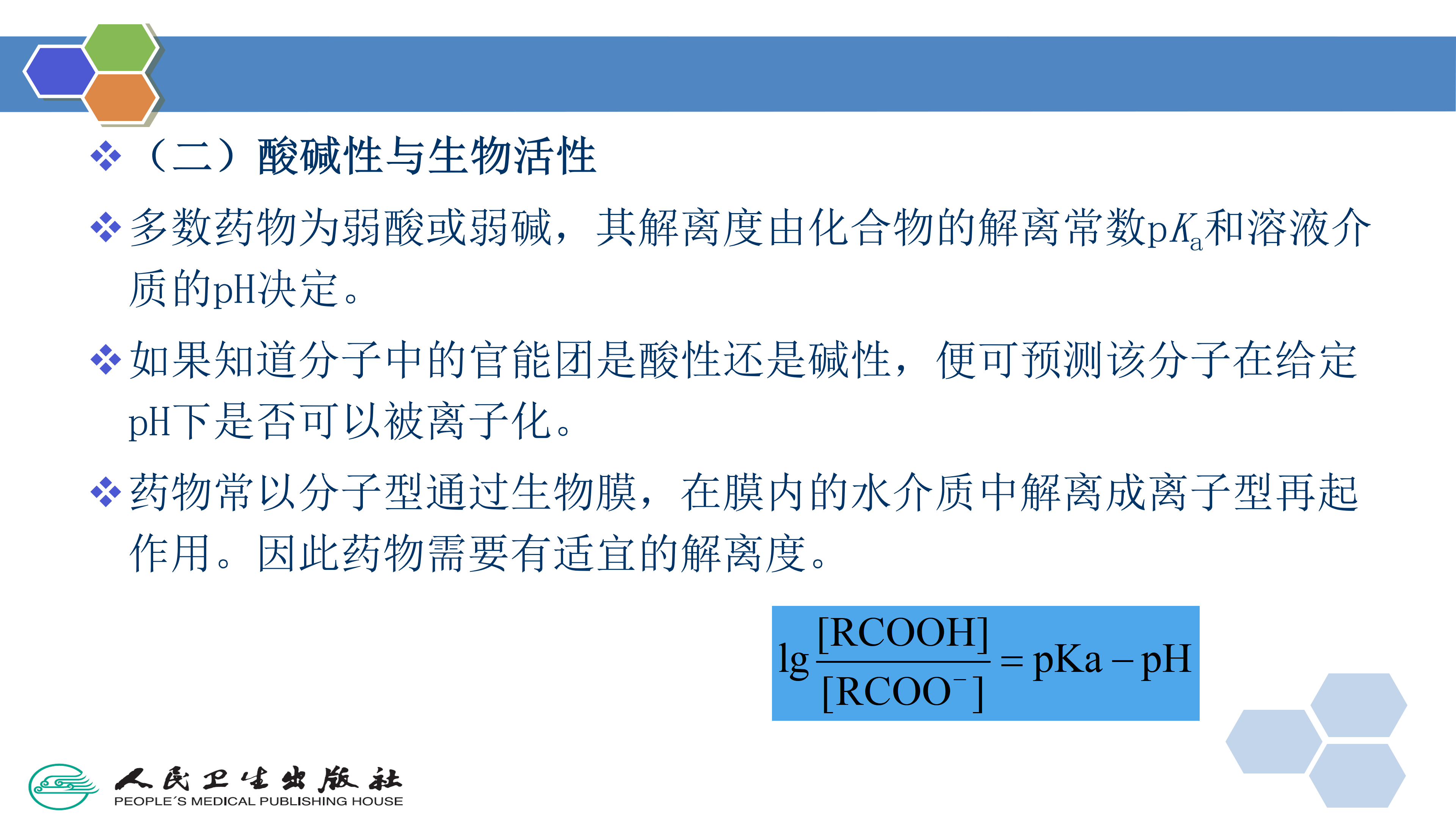 药物常以分子型通过生物膜,在膜内的水介质中解离成离子型再起作用。因此药物需要有适宜的解离度。