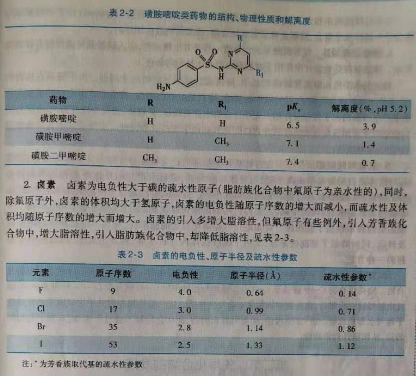 烷基的给电子效应会影响到化合物中电子的分布,因而影响其解离度,进而影响生物活性。例如磺胺嘧啶,由于嘧啶环的吸电子效应,使磺酰氨基有较大的解离度,磺胺甲嘧啶和磺胺二甲嘧啶,由于嘧啶环上一个甲基和两个甲基的给电子效应,同时甲基的存在阻碍了分子间氢键和偶极-偶极相互作用,减少了分子间的缔合,从而使解离度降低,见表2-2。