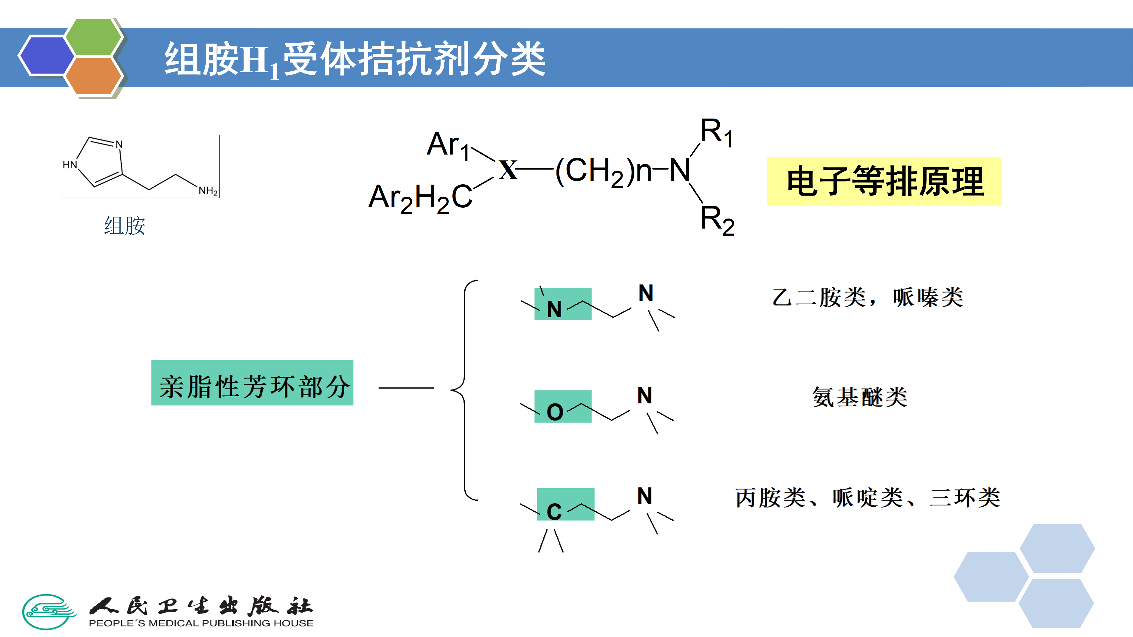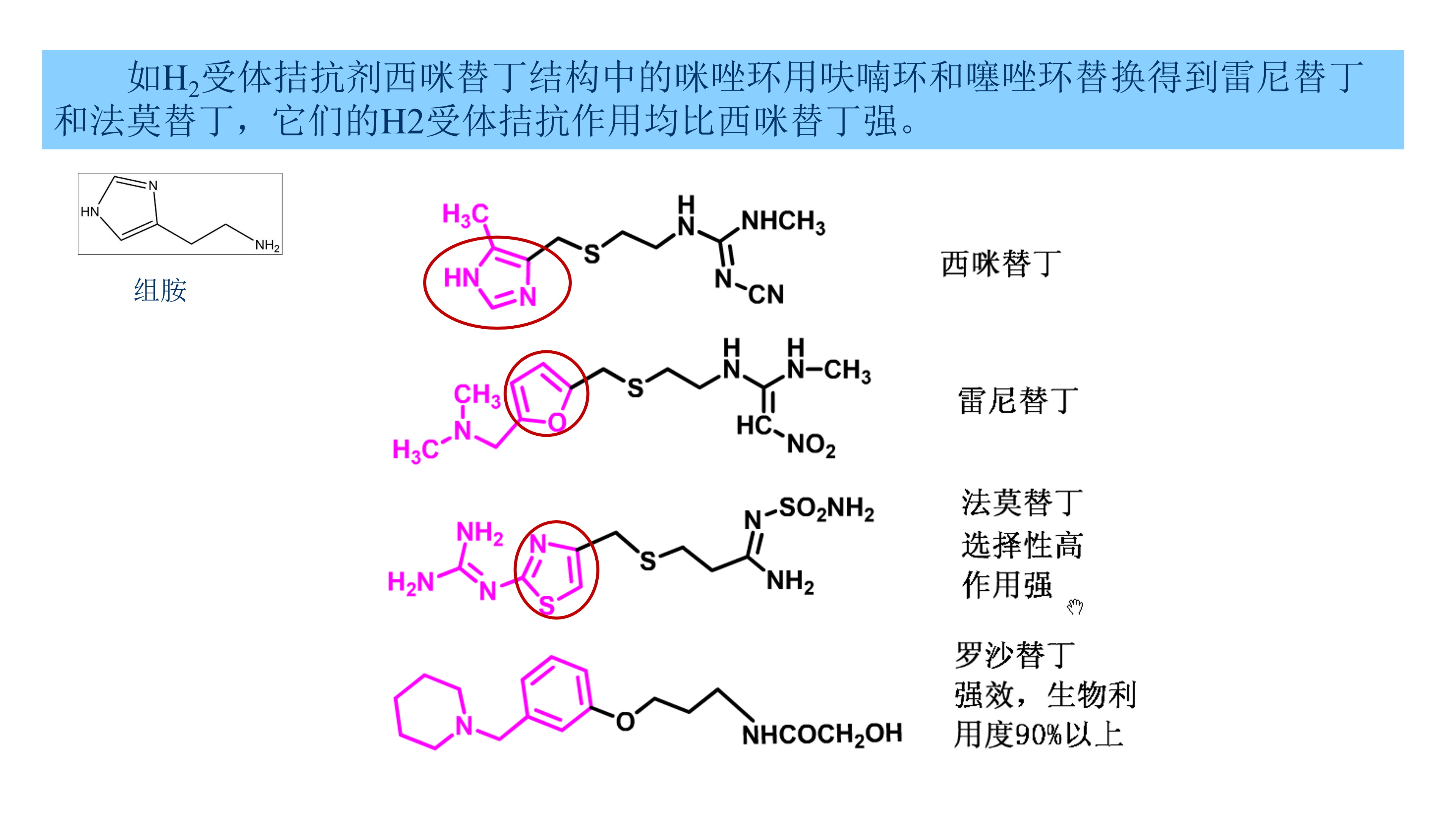 利用生物电子等排体对先导化合物中的某一个基团逐个进行替换得到一系列的新化合物,是药物化学家设计研究药物的经典方法,有许多成功例子。例如将H2受体拮抗剂西咪替丁(cimetidine)结构中的咪唑环用呋喃环和噻唑环替换得到雷尼替丁( ranitidine)和法莫替丁( famotidine),它们的H2受体拮抗作用均比西咪替丁强。