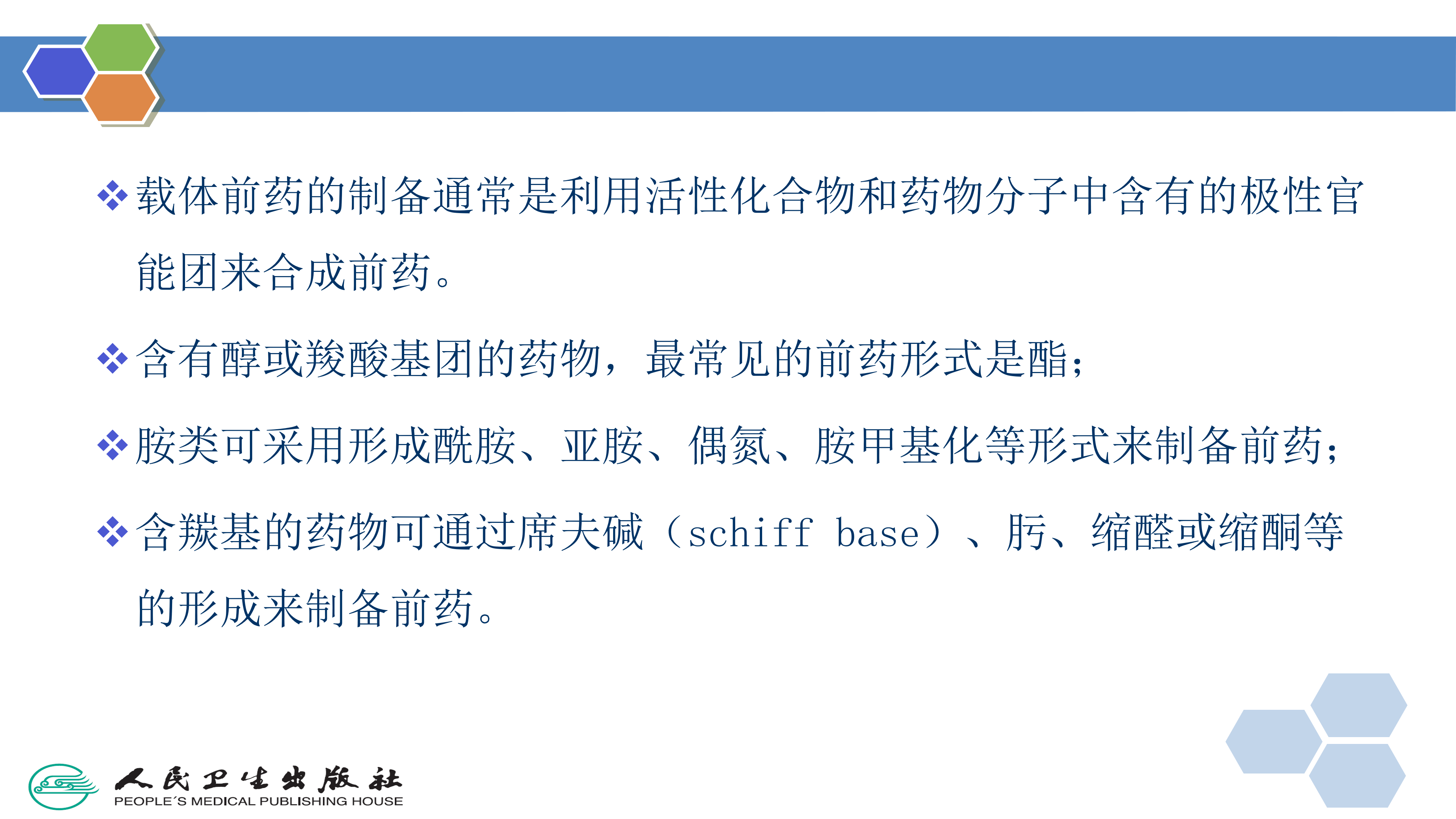 载体前药的制备通常是利用活性化合物和药物分子中含有的极性官能团来合成前药。含有醇或羧酸基团的药物,最常见的前药形式是酯;胺类可采用形成酰胺、亚胺、偶氮、胺甲基化等形式来制备前药;含羰基的药物可通过席夫碱( schiff base)、肟、缩醛或缩酮等的形成来制备前药。