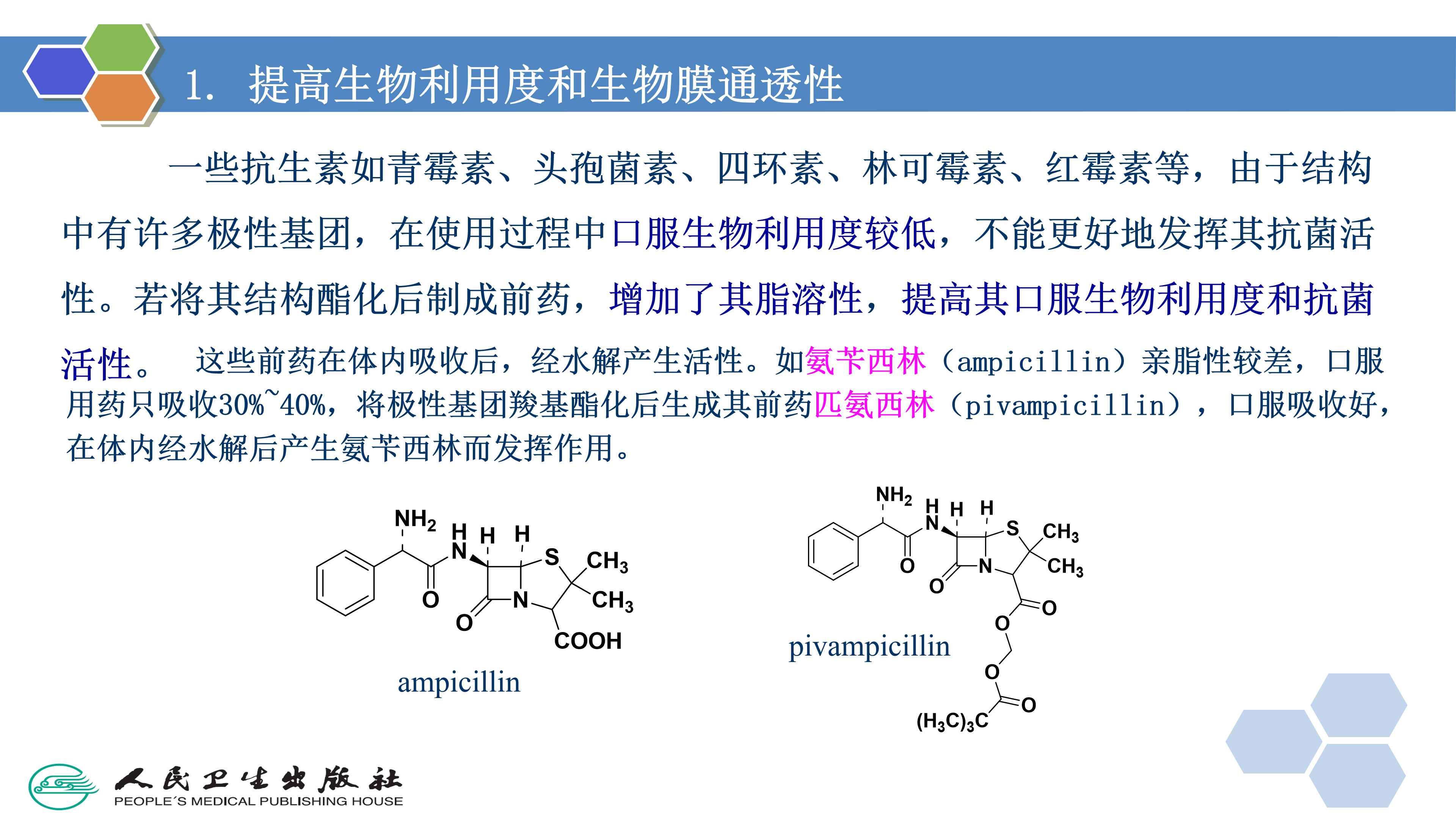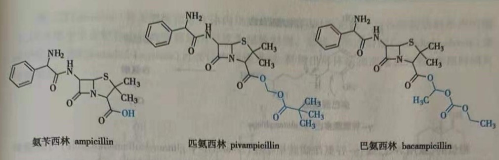 氨苄西林( ampicillin)口服吸收较差(大约为40%),将其羧基酯化形成易被酶裂解的酯—匹氨西林( pivampicillin)和巴氨西林( bacampicillin),口服时几乎定量吸收,这两种前药的给药剂量较氨苄西林低,安全有效。