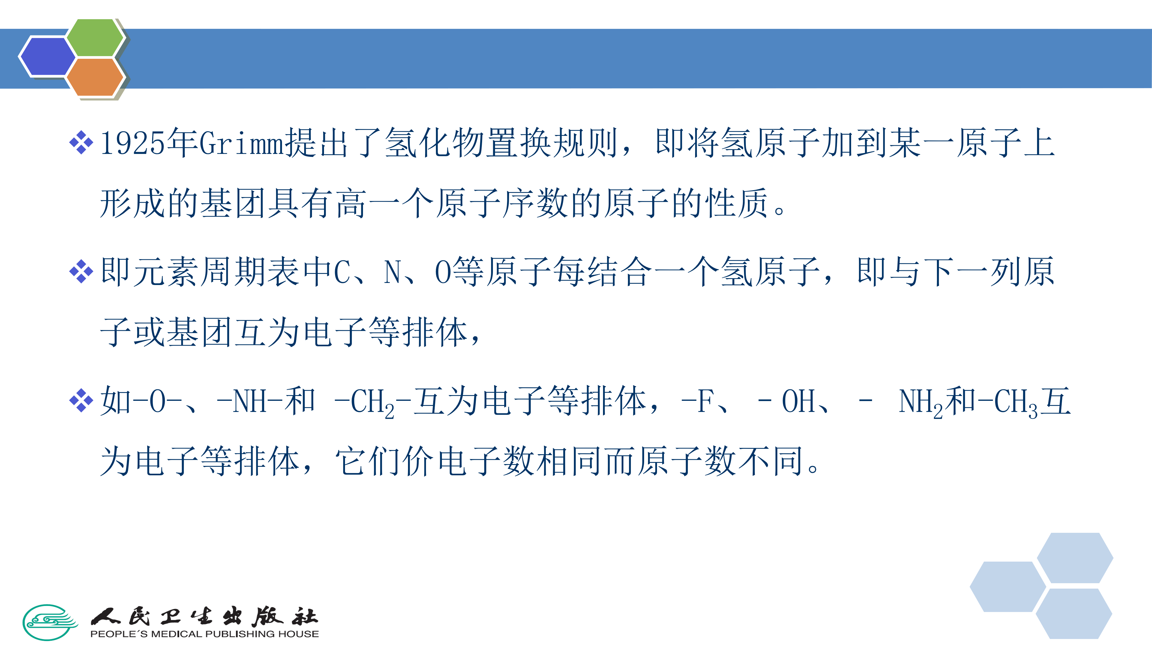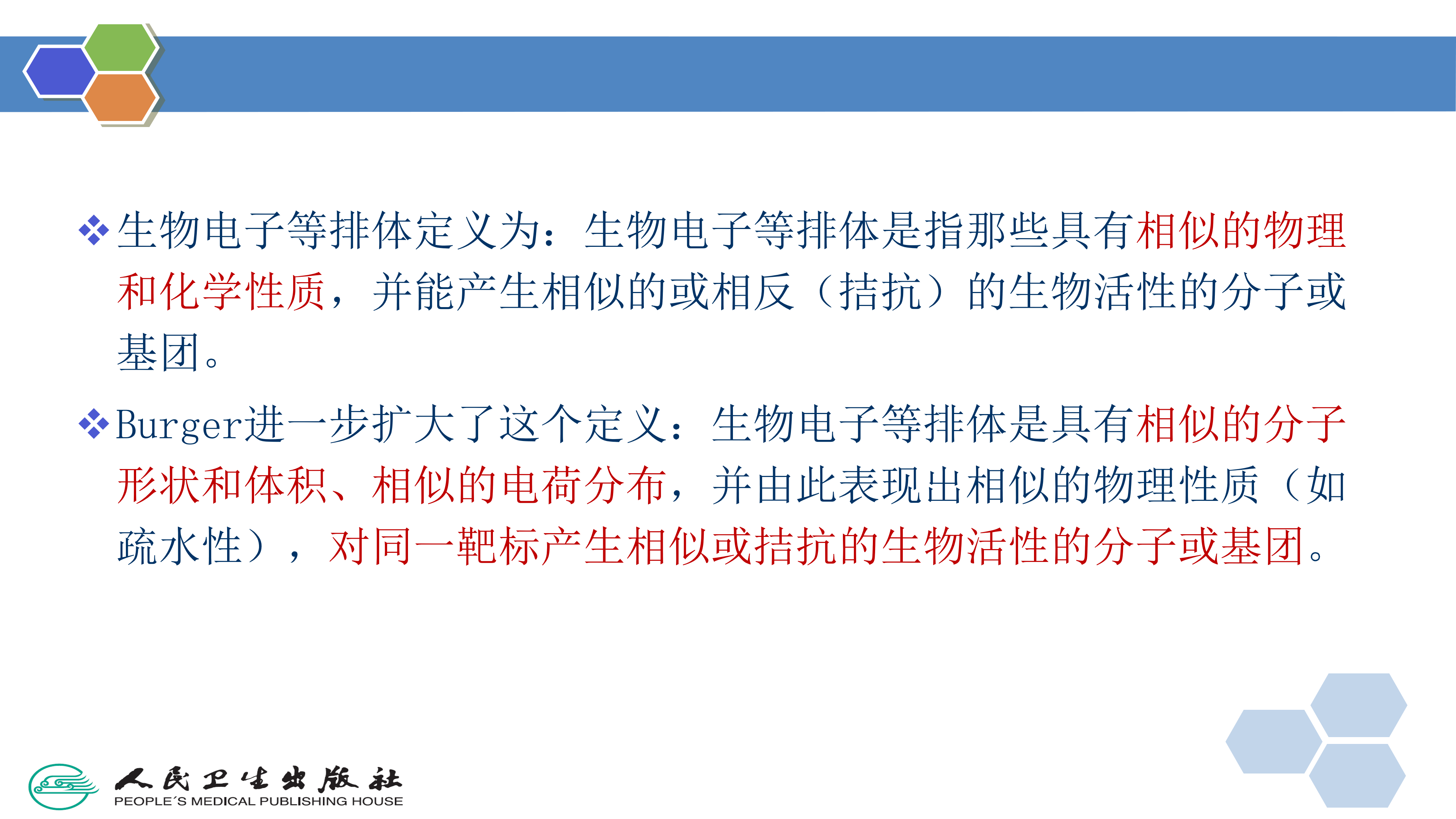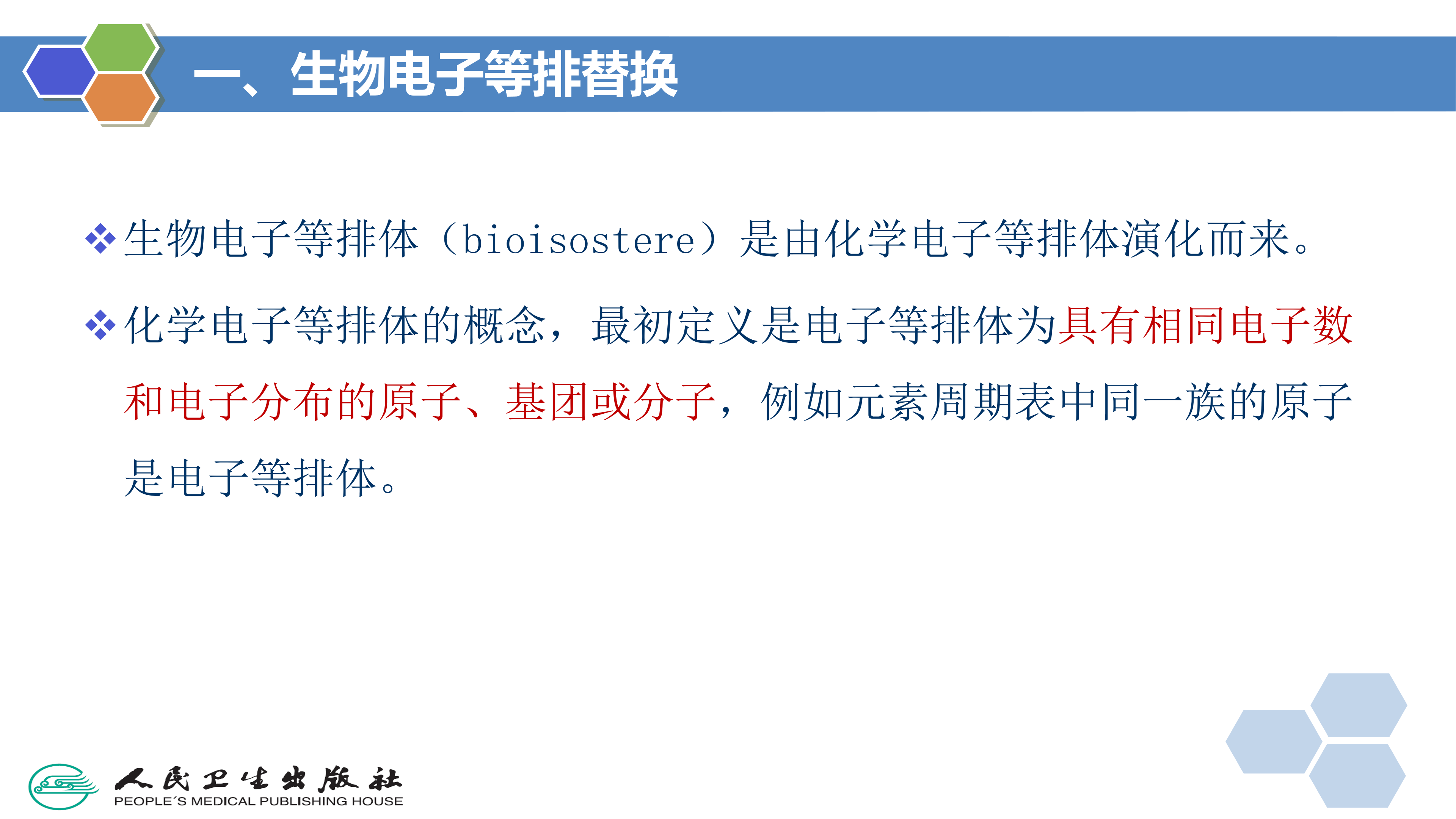 生物电子等排体(bioisostere)是由化学电子等排体( chemical isostere)演化而来。1919年Langmuir首先提出化学电子等排体的概念,最初定义是电子等排体为具有相同电子数和电子分布的原子、基团或分子,例如元素周期表中同一族的原子是电子等排体,重氮甲烷和乙烯酮是电子等排体,N2O和CO2是电子等排体。1925年 Grimm提出了氢化物置换规则,即将氢原子加到某一原子上形成的基团具有高一个原子序数的原子的性质。即元素周期表中C、N、O等原子每结合一个氢原子,即与下一列原子或基团互为电子等排体,如—0—、—NH—和—CH2—互为电子等排体,—F、—OH、—NH2和一CH3互为电子等排体,它们价电子数相同而原子数不同。后来, Friedman提出了生物电子等排体的概念,用来描述具有相同类型生物活性的电子等排体,而且, Friedman将具有相反生物活性的电子等排体(如拮抗剂)也定义为生物电子等排体,因为它们通常作用于相同的结合位点上(如对氨基苯甲酸和对氨基苯磺酰胺)。因此,生物电子等排体定义为:是指那些具有相似的物理和化学性质,并能产生相似的或相反(拮抗)的生物活性的分子或基团。 Burger进一步扩大了这个定义:生物电子等排体是具有相似的分子形状和体积、相似的电荷分布,并由此表现出相似的物理性质(如疏水性),对同一靶标产生相似或拮抗的生物活性的分子或基团。