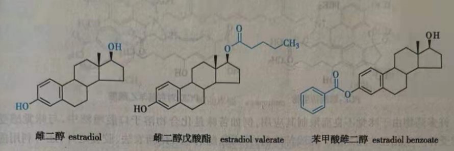 雌二醇(estradiol)等天然雌激素在体内迅速代谢,作用时间短暂。与长链脂肪酸形成的酯类,因不溶于水而贮存于体内脂肪组织中成为延效制剂。如雌二醇戊酸酯( estradiol valerate)及苯甲酸雌二醇( estradiol benzoate)可在体内缓慢水解,释放出母体药物而延长疗效,作用时间可持续数周。