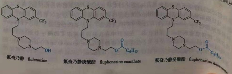 除非药物能蓄积在脂肪中,否则口服给药的药物作用时间不会比它们在胃肠道的转运时间(12~48小时)长很多。对于那些被身体快速清除的药物,其作用时间更短,因此需要在24小时内多次给药以维持血药浓度在治疗水平。为延长药物的作用时间,可制备亲脂性前药,将其溶解或悬浮在油性介质中,深部肌内注射给药。例如,抗精神病药氟奋乃静(flufenazine)作用时间较短(6~8小时),利用其分子中的羟基,制成庚酸酯( fluphenazine enanthate)和癸酸酯( fluphenazine decanoate),作用时间可达一个月左右,适用于需要长期用药及顺从性不好的精神分裂症患者