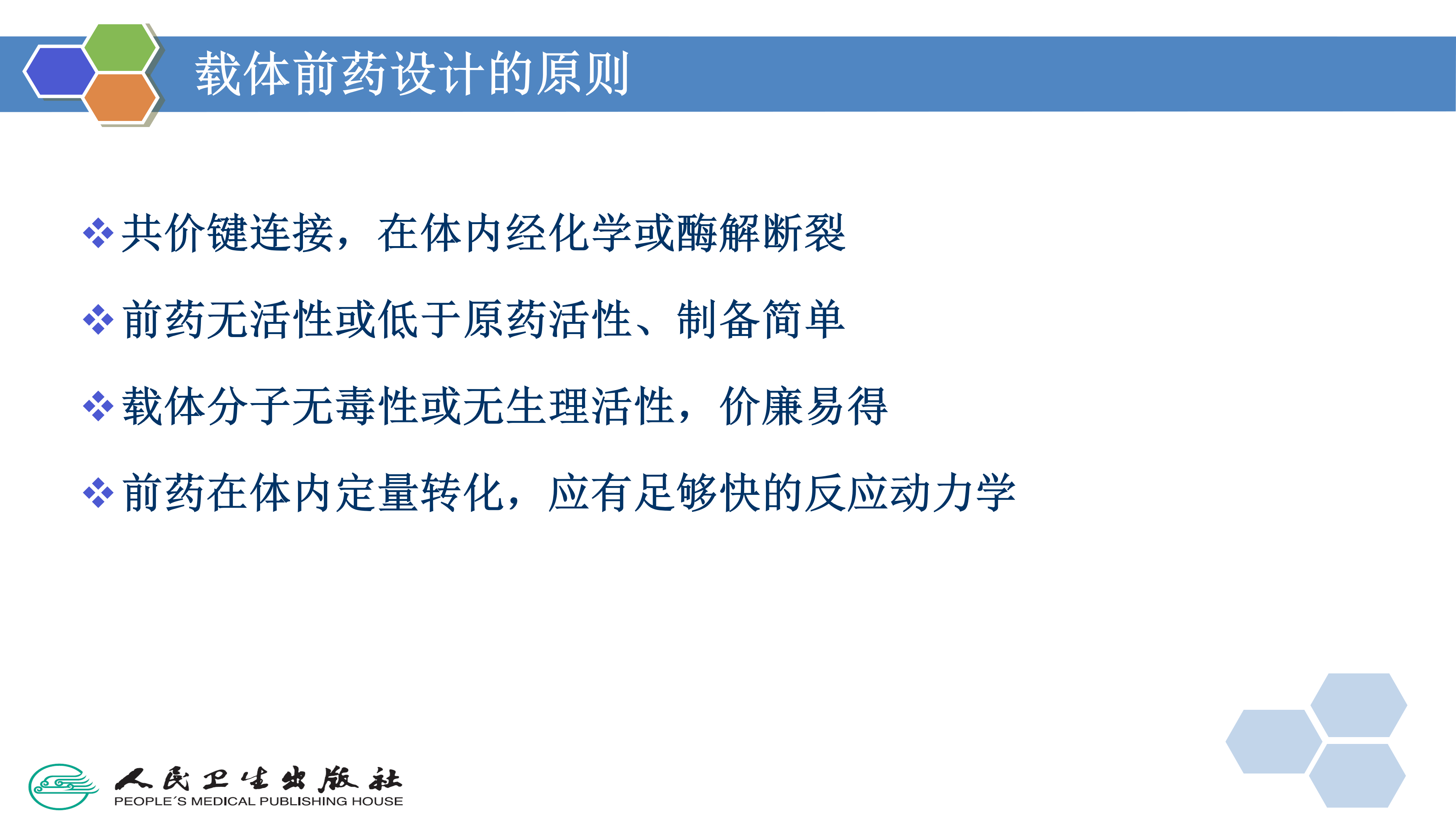 一个设计优良的载体前药应符合以下标准:前药应无活性或活性低于母体药物;药物与载体一般以共价键连接;药物与载体间的连接在体内一定能断开;前药以及在体内释放出来的载必须是无毒的;为保证在作用部位达到有效浓度以及尽量减少前药的直接代谢或逐渐失活,母体药物的释放要足够快。