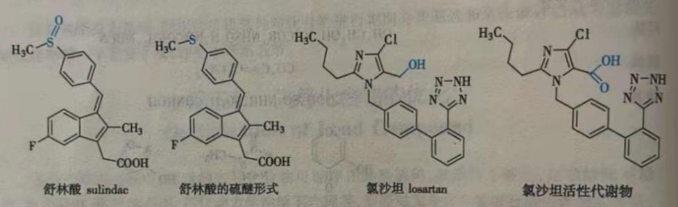 生物前体(bioprecursors)是通过对有活性的化合物进行分子修饰得到的新化合物,该新化合物是代谢酶的底物,经过酶的代谢产生的活性代谢物是预期的活性分子。如非甾体抗炎药舒林酸( sulindac)就是一个典型的生物前体前药。舒林酸本身没有活性,在体内经还原性生物活化转化为硫醚形式而发挥抗炎活性。