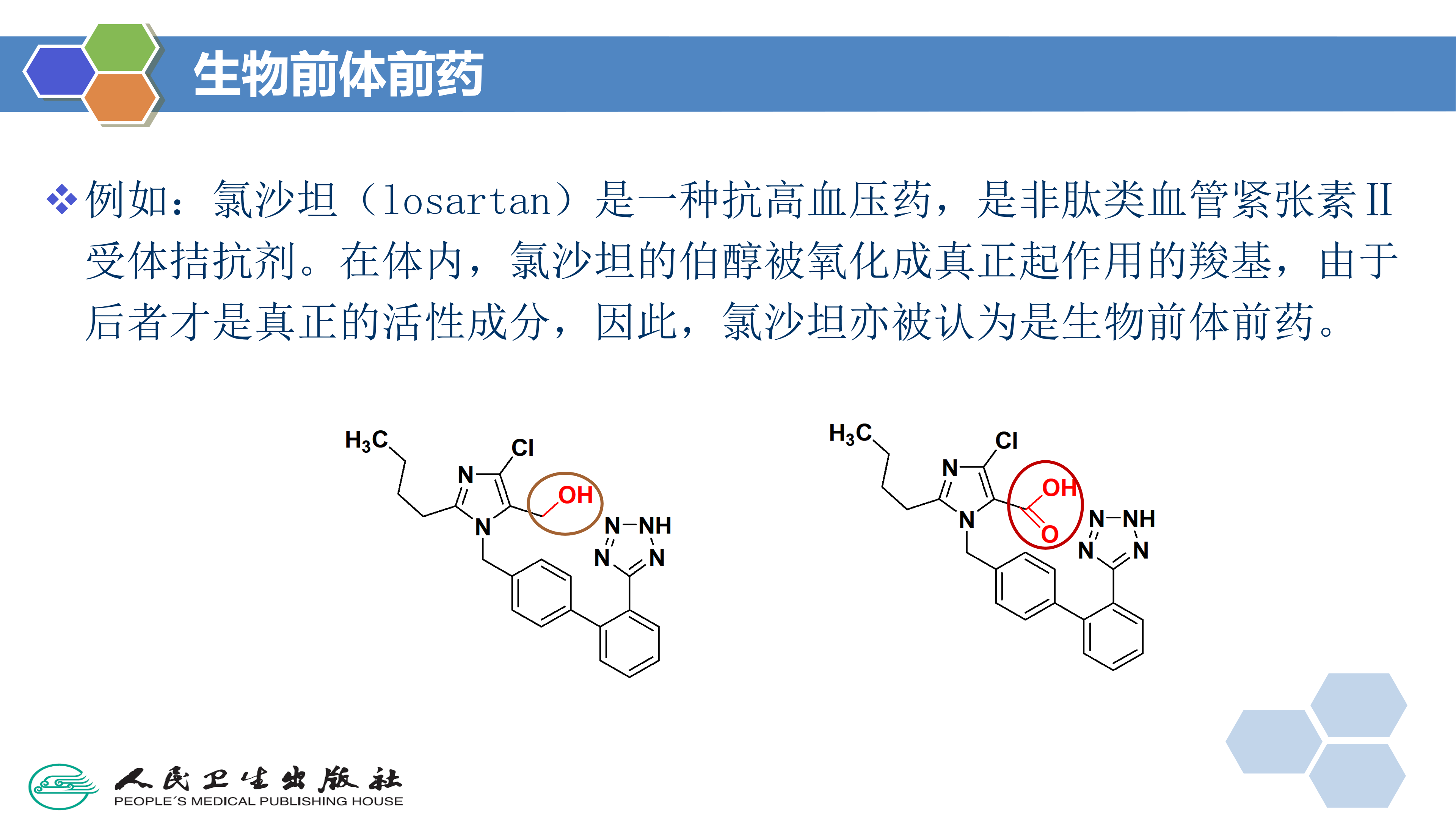 氯沙坦(losartan)是一种抗高血压药,是非肽类血管紧张素Ⅱ受体拮抗剂。在体内,氯沙坦的伯醇被氧化成真正起作用的羧基,由于后者才是真正的活性成分,因此,氯沙坦亦被认为是生物前体前药。