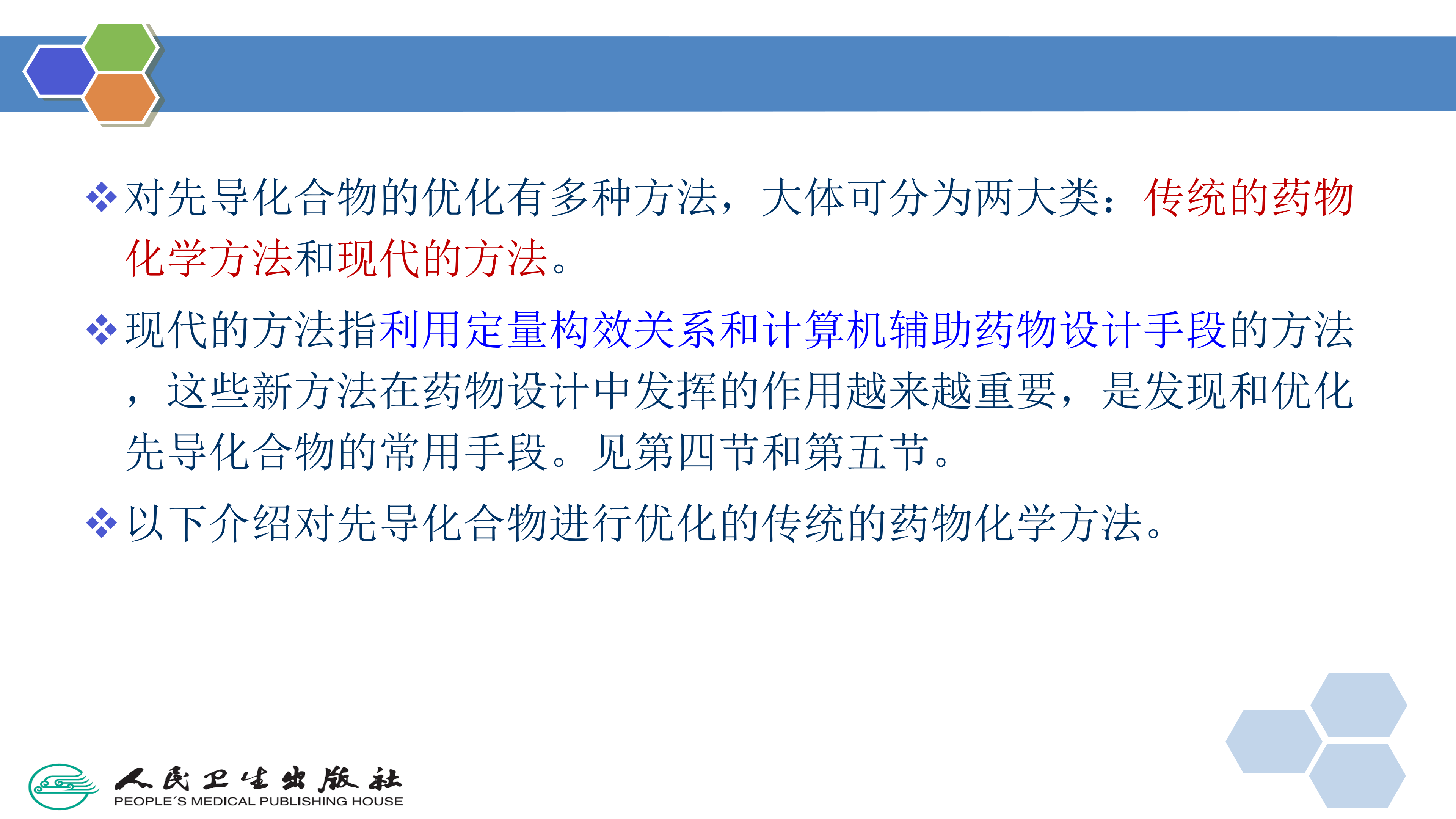 对先导化合物的优化有多种方法,大体可分为两大类:传统的药物化学方法和现代的方法。现代的方法指利用计算机辅助药物设计的手段和利用定量构效关系的方法,这些新方法在药物设计中发挥的作用越来越重要,是发现和优化先导化合物的常用手段,这部分内容在第四节和第五节介绍。以下介绍对先导化合物进行优化的传统的药物化学方法。
