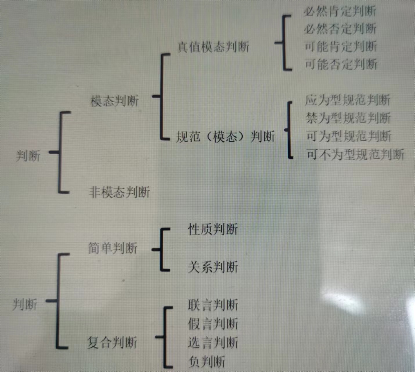对于非模态判断,根据判断中是否包含其它判断,将其分为简单判断和复合判断。简单判断按其是对事物的性质还是事物之间的关系断定,分为性质判断和关系判断。复合判断依据其组成的肢判断之间的结合情况不同,分为联言判断、选言判断、假言判断及负判断。