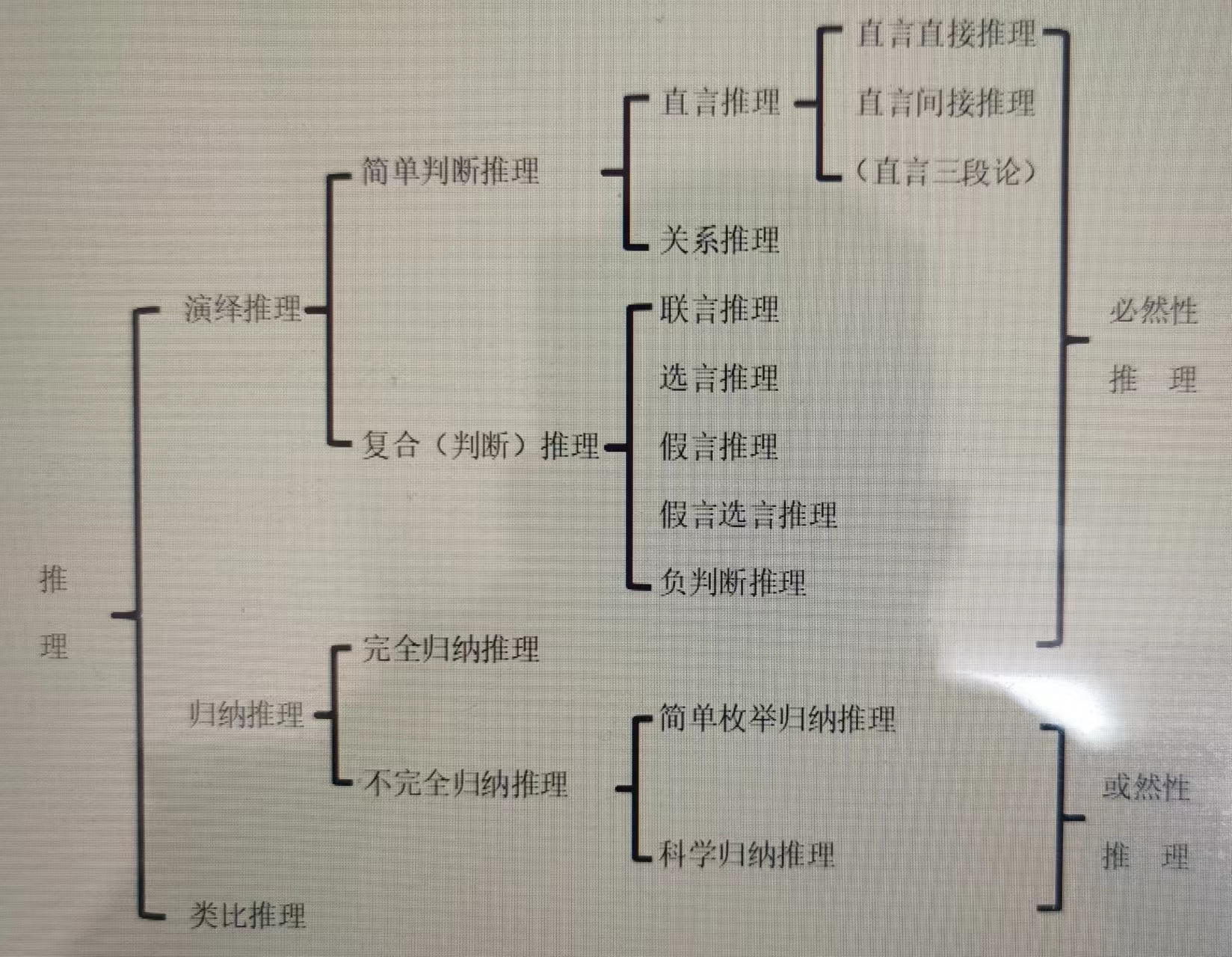 (四)对于演绎推理而言,又可以根据前提判断类型的不同,推理可分为简单判断推理和复合(判断)推理。简单判断推理又可分为性质(直言)推理和关系推理;复合推理又可分为联言推理、选言推理、假言推理、假言选言推理和负判断推理。此外,如果前提中有模态判断,则推理为模态推理。