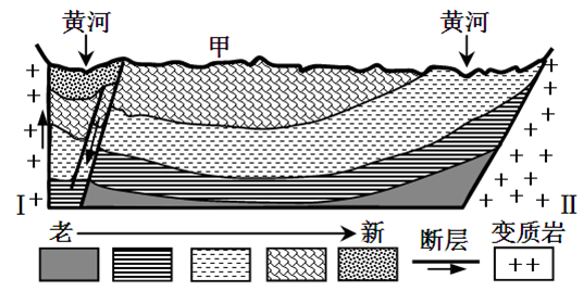(2)甲地是我国“西气东输”重要的气源地,说出形成该气源地的地质构造和岩石类型
