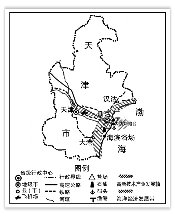 例2、在重振天津经济的今天,国家“十一五”规划指出:开发天津滨海新区,带动区域经济发展。 滨海新区位于天津市的东部临海地区,总体空间布局为高新技术产业发展轴和海洋经济发展带组成的 “T”型结构。