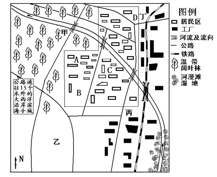 例2、某中等城市布局示意图如下,分析回答下列问题(20分)