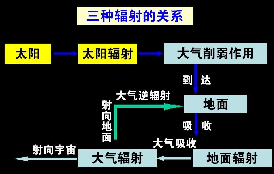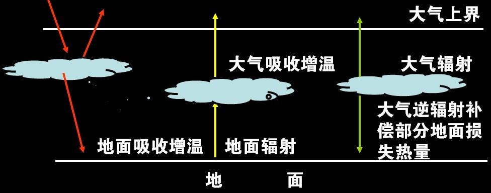 地面把太阳短波辐射转变为长波辐射后,穿越大气层被大气中CO₂、H₂O吸收,大气增温。
