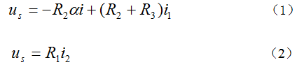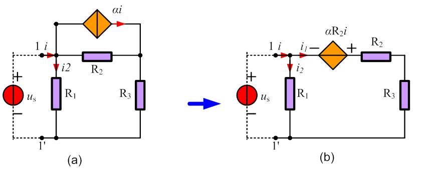 求图示电路(a)中的输入电阻Rin。例2-7-1电路图 在端口1-1’处加电压us,求出i,再由定义求输入电阻Rin。将CCCS和电阻R2的并联组合等效变换为CCVS和电阻的串联组合,如图(b)所示。根据KVL,有: 再由KCL, ,可得,代入(1)式,整理后,有 上式分子中有负号出现,因此,在一定的参数条件下,Rin有可能是零,也有可能是负值。若是负值,则是一个发出功率的元件。