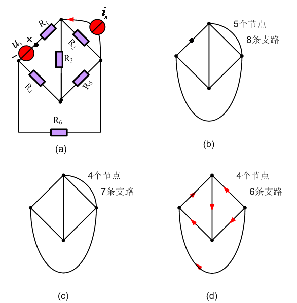 在电路中,我们要指定每一条支路中的电流参考方向。电压一般取关联参考方向。同样,对电路的图中每一支路也要指定一个方向,此方向即该支路电流的参考方向,这样得到的图叫“有向图”,如图3.1.1d所示,而图3.1.1b,c中各支路未赋以方向,所以称为无向图。