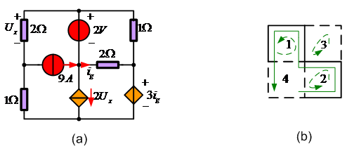 2、比较图4.10.3所示的三个电路图,分析两种特殊情况电路相对于基本电路分别有什么区别?根据回路电流法核心要素总结下两种特殊情况处理思路?