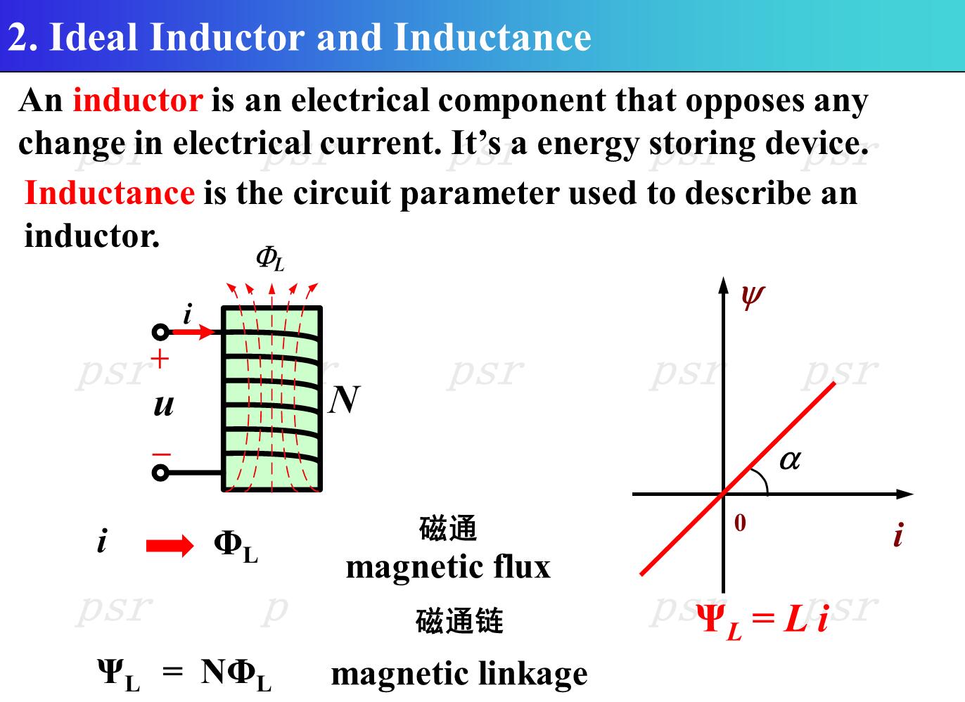 任何时刻,通过线性电感元件的电流i与其磁链y 成正比。y~i 韦安特性是过原点的直线(如图1.7.3所示)。